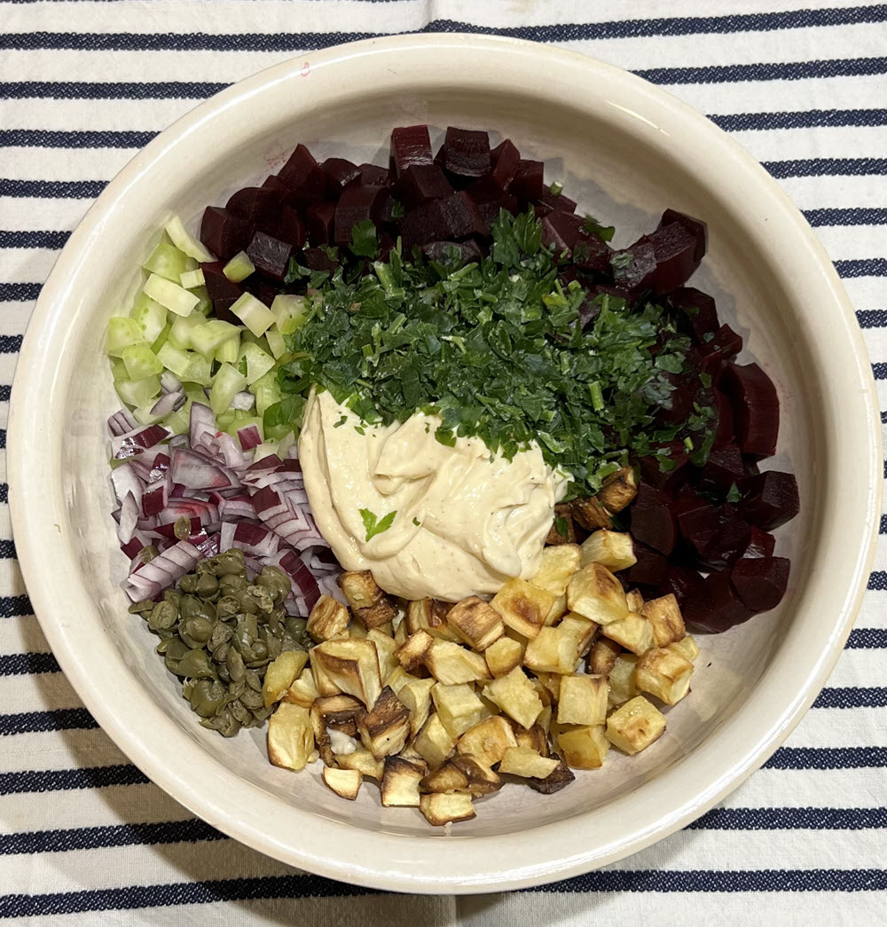 Kai visos daržovės atvėsusios, sudėkite jas į didesnį dubenį – burokėlius, pastarnokus, salierą, svogūną, kaparėlius ir petražoles. Supilkite paruoštą padažą ir viską švelniai, bet gerai išmaišykite.
