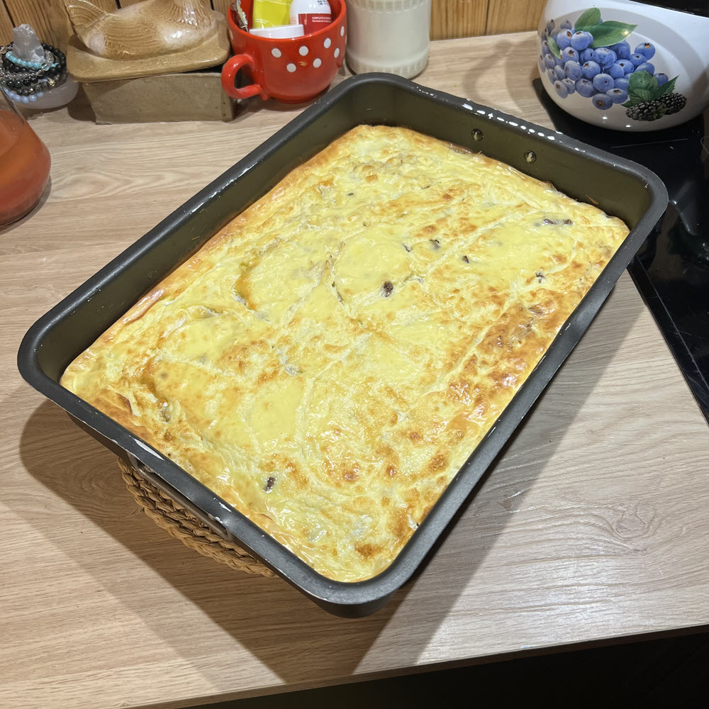 Sumaišykite jogurtą, kiaušinį ir miltus. Gauta mase, nuėmus foliją, užpilkite plovą. Palaistykite tirpintu sviestu. Toliau kepkite, kol viršus gražiai apskrus.