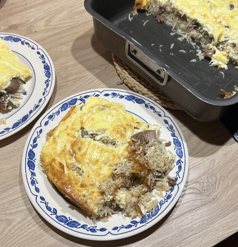 Mėsą išimkite ir skysčio, sudėkite į kepimo formą su aukštesniais kraštais. Ant viršaus užberkite perplautus ryžius. Supilkite nuo troškinimosi likusį sultinį. Pildami skystį matuokite stiklinėmis, turi būti 2,5 stiklinės. Man dažniausiai pritrūksta, todėl iki reikiamo kiekio tiesiog dapilu vandens. Paragaukite ar netrūksta druskos, dažniausiai reikia dadėti. Kepimo formą uždenkite folija ir toliau troškinkite iki 180 °C įkaitintoje orkaitėje apie 40 minučių.