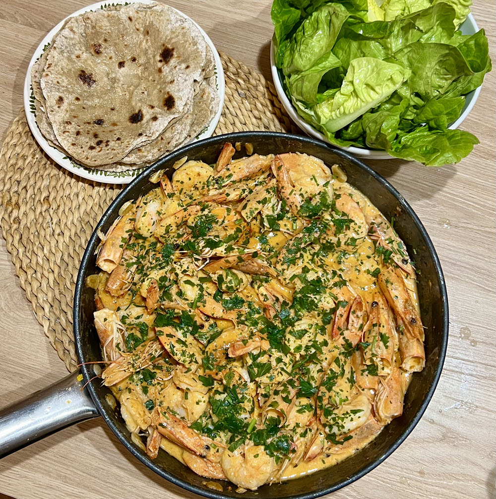 Krevetės su kario pasta – paprastas, sodrus ir labai skanus patiekalas, prie kurio galite priderinti įvairias salotas, duoneles, kiekvieną kartą padarydami jį išskirtinį ir nenuobodų.